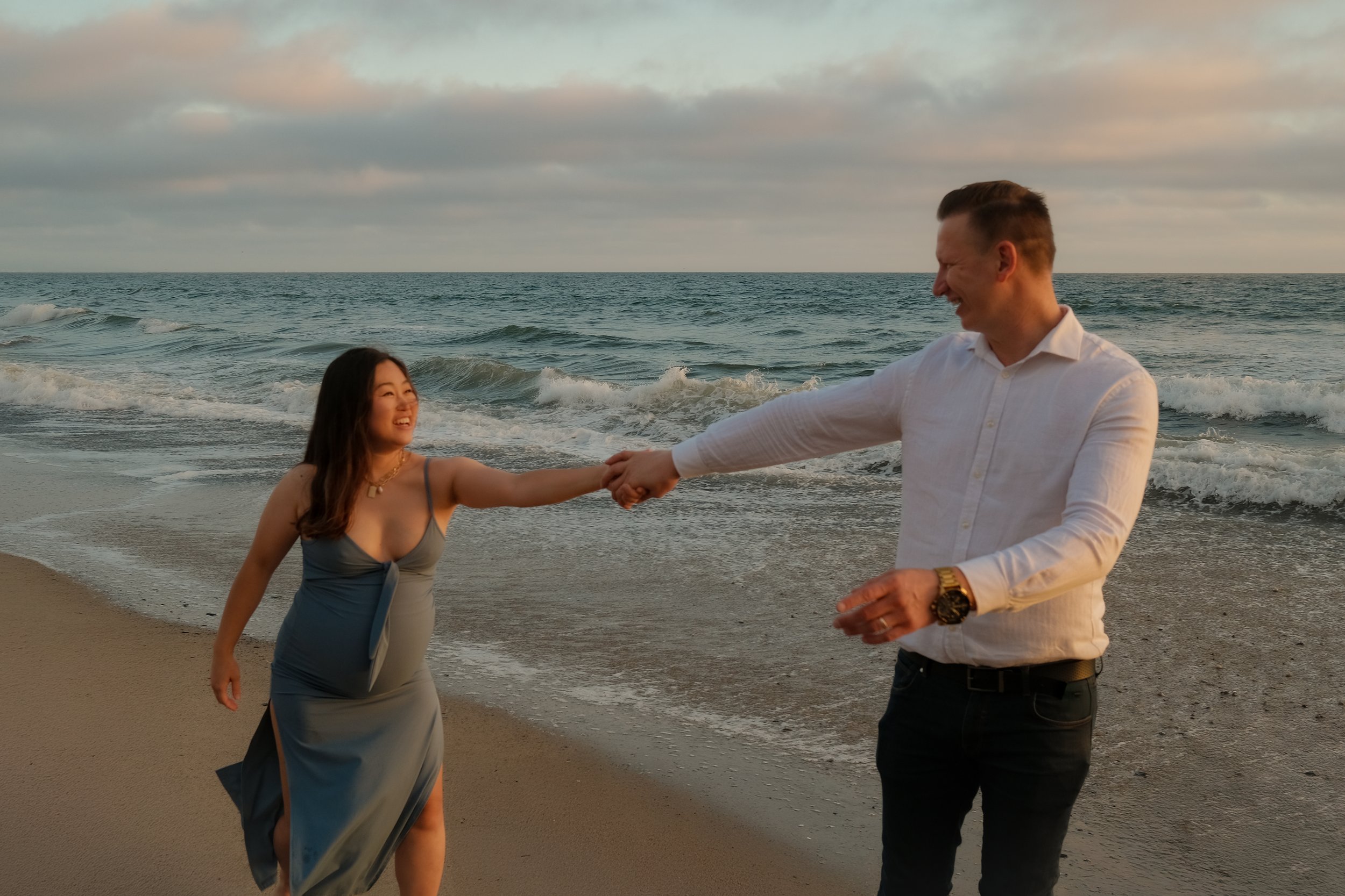 A Black and white photo of a couple holding hands and running along the beach, with the ocean in the background. The woman is wearing a flowing dress, and the man is in a jacket and pants.